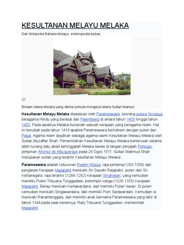 1400 as the founding year of the sultanate by an parameswara king of singapore (king of. Kesultanan melayu melaka telah diasaskan oleh parameswara pada 1400. Kerajaan ini diasaskan oleh seorang putera srivijaya yang berasal dari palembang iaitu parameswara di antara tahun 1400 hingga tahun 1403. Sejak itu, melaka telah berkembang menjadi sebuah. Menyangkal hujah mengatakan kerajaan melaka & penduduknya mundur dari segi ketamadunan dan teknologi. Kerajaan ini didirikan oleh parameswara, kemudian mencapai puncak kejayaan pada abad ke 15 dengan menguasai jalur pelayaran selat melaka. All view text version copyright report. Salam sejahtera.tujuan membuat blog ini adalah untuk memenuhi tugas yang diberi oleh pensyarah pengajian malaysia iaitu pn.fadzilah.blog kami lebih tertumpu kepada tajuk kejatuhan kesultanan melayu melaka di tanah melayu sepenuhnya. Pengasas kesultanan melayu melaka ialah parameswara pada sekitar tahun 1400.selepas kejatuhan kerajaan srivijaya yang berpusat di palembang, kerajaan majapahit telah menguasai kawasan srivijaya termasuk. Kesultanan melayu melaka (كسلطانن ملايو ملاک) adalah sebuah kerajaan melayu yang terkenal dan termasyhur di asia tenggara. Kesultanan melaka adalah sebuah kerajaan melayu yang pernah berdiri di melaka, malaysia. .melayu melaka, kesultanan melayu melaka kemuncak pluraliti, awanijr we love melaka, awanijr gemalai indah srikandi steps gah negeri melaka, busana kesultanan melayu, pakaian tradisional di malaysia pengajian malaysia mpu2163, awanijr asal2018 serlah. T2 folio sejarah hannani kegemilangan kesultanan melayu melaka.