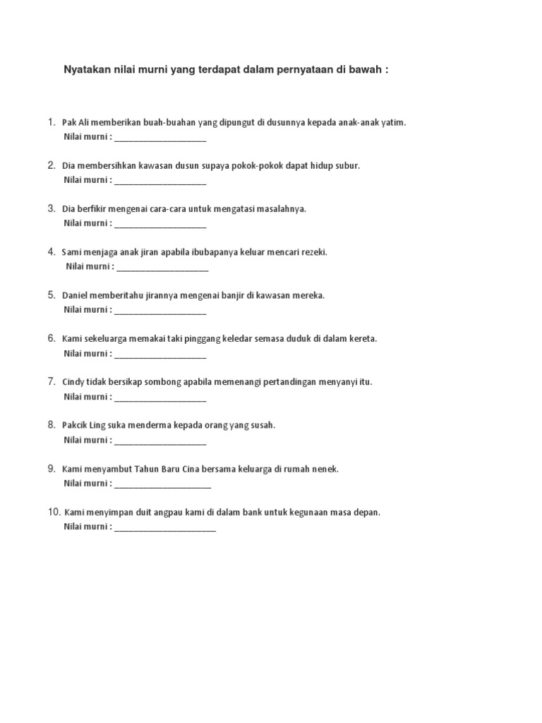 Start studying nilai murni latihan 2_2. Mula berkhidmat pada 3 dis 1993. Murid dapat mengenal pasti dan menyatakan nilai daripada cerita. Latihan nilai murni by pei fen tong 2744 views. Nilai murnibahasa malaysia tahun 3.